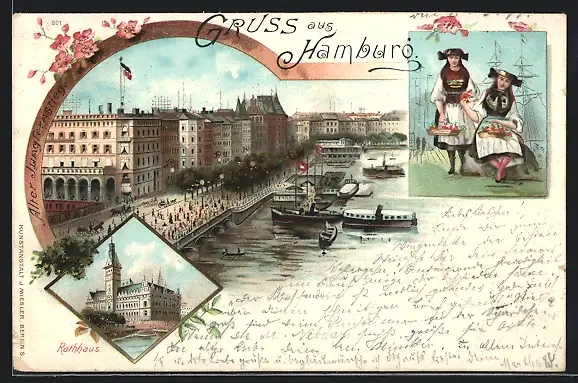 Lithographie Hamburg-Neustadt, Rathaus, Alter Jungfernstieg & Frauen in Tracht
