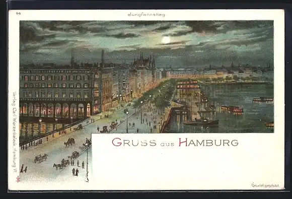 Lithographie Hamburg-Neustadt, Strasse Jungfernstieg mit Pferdewägen, Neujahrsgruss