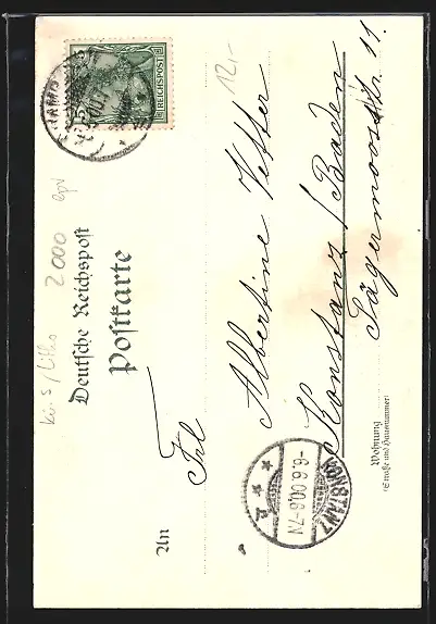 Personenbezogene Daten auf der Rückseite der Karte wurden durch blauen Textmarker unkenntlich gemacht. Die blauen Stellen sind auf die Vorderseite durchgeweicht und wirken sich negativ auf das Postkartenfoto aus
