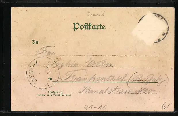 Personenbezogene Daten auf der Rückseite der Karte wurden durch blauen Textmarker unkenntlich gemacht. Die blauen Stellen sind auf die Vorderseite durchgeweicht und wirken sich negativ auf das Postkartenfoto aus