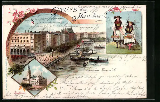 Lithographie Hamburg, Rathaus, Alter Jungfernstieg, Vierländerin
