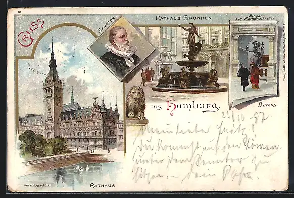Lithographie Hamburg, Rathaus Brunnen, Bachus, Senator