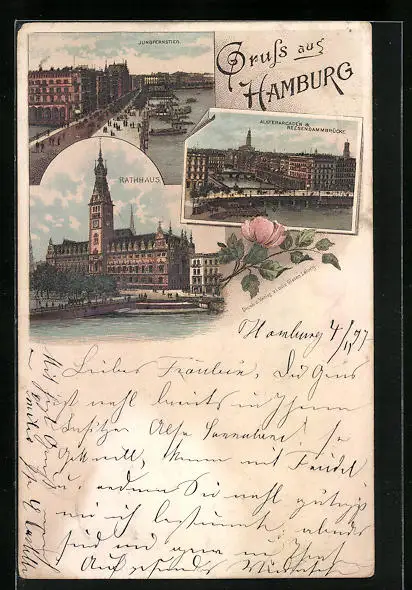 Lithographie Hamburg, Rathaus, Jungfernstieg und Alsterarcaden