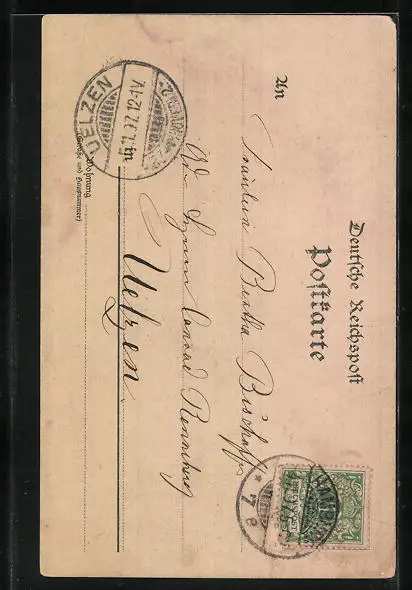 Personenbezogene Daten auf der Rückseite der Karte wurden durch blauen Textmarker unkenntlich gemacht. Die blauen Stellen sind auf die Vorderseite durchgeweicht und wirken sich negativ auf das Postkartenfoto aus