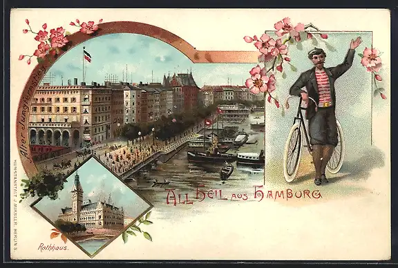 Lithographie Hamburg, Rathaus, Uferpartie, Mann mit Fahrrad
