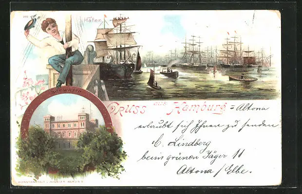 Lithographie Hamburg, Seewarte, Hafen, Schiffsjunge