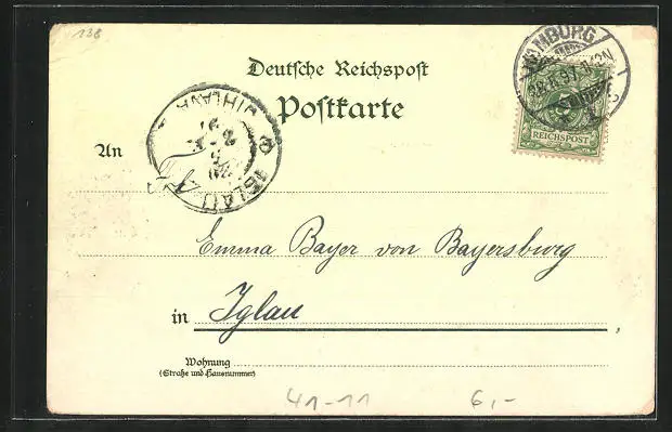 Personenbezogene Daten auf der Rückseite der Karte wurden durch blauen Textmarker unkenntlich gemacht. Die blauen Stellen sind auf die Vorderseite durchgeweicht und wirken sich negativ auf das Postkartenfoto aus
