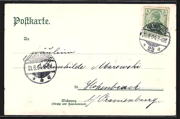 Personenbezogene Daten auf der Rückseite der Karte wurden durch blauen Textmarker unkenntlich gemacht. Die blauen Stellen sind auf die Vorderseite durchgeweicht und wirken sich negativ auf das Postkartenfoto aus