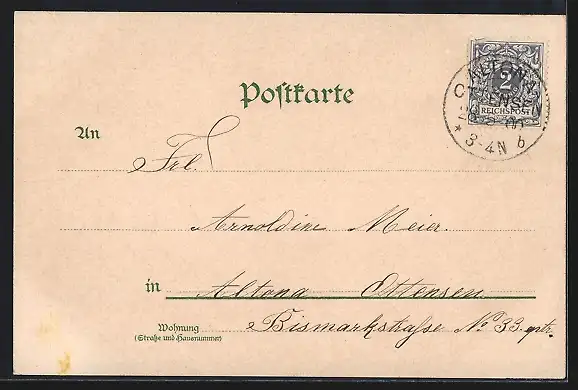 Personenbezogene Daten auf der Rückseite der Karte wurden durch blauen Textmarker unkenntlich gemacht. Die blauen Stellen sind auf die Vorderseite durchgeweicht und wirken sich negativ auf das Postkartenfoto aus