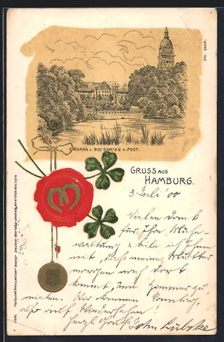 Lithographie Hamburg-St.Pauli, Botanischer Garten und Postamt