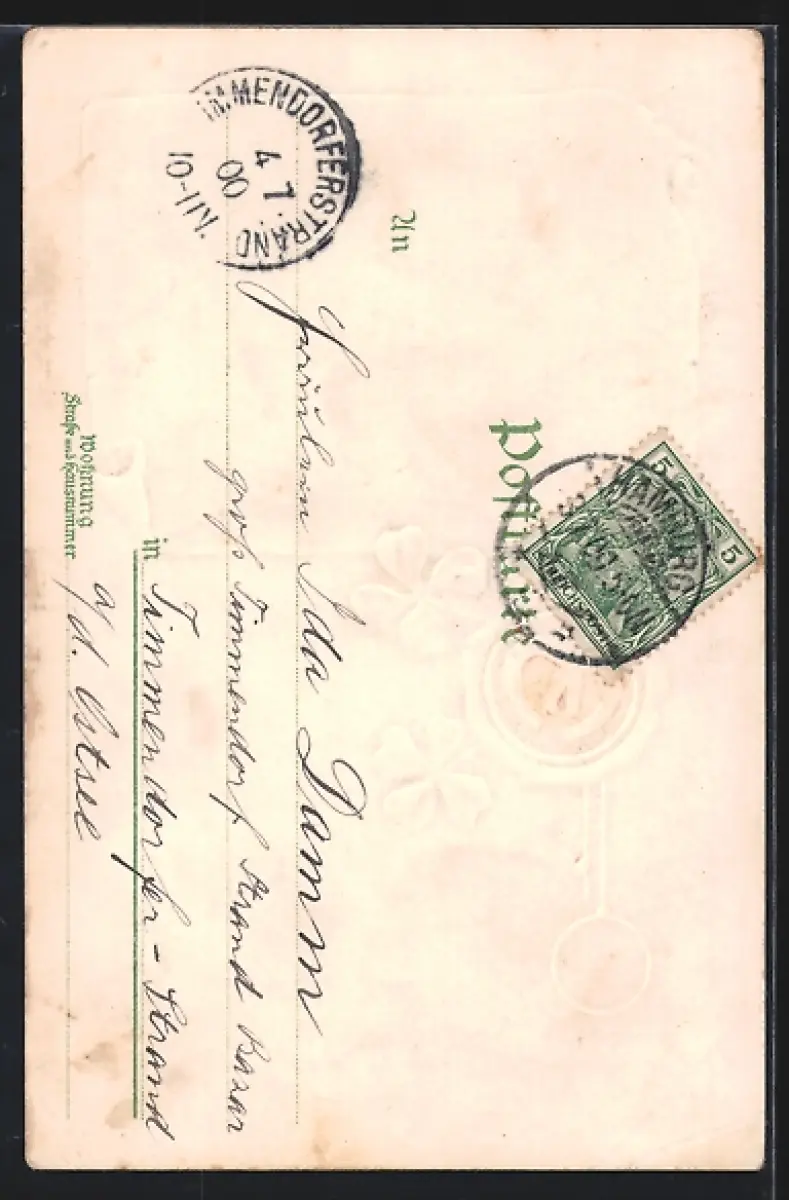 Personenbezogene Daten auf der Rückseite der Karte wurden durch blauen Textmarker unkenntlich gemacht. Die blauen Stellen sind auf die Vorderseite durchgeweicht und wirken sich negativ auf das Postkartenfoto aus