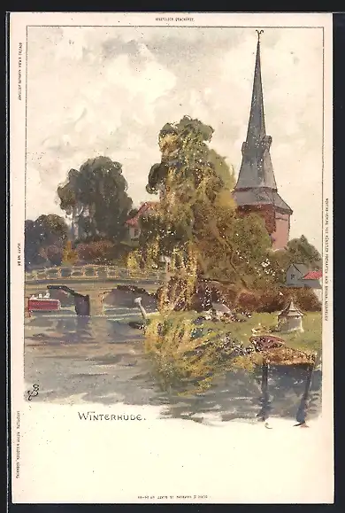 Lithographie Hamburg-Winterhude, Ortspartie mit Brücke