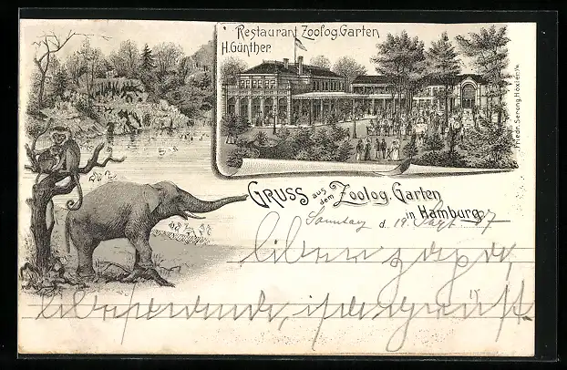 Lithographie Hamburg, Zoologischer Garten mit Restaurant von H. Günther