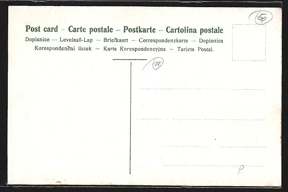 Personenbezogene Daten auf der Rückseite der Karte wurden durch blauen Textmarker unkenntlich gemacht. Die blauen Stellen sind auf die Vorderseite durchgeweicht und wirken sich negativ auf das Postkartenfoto aus