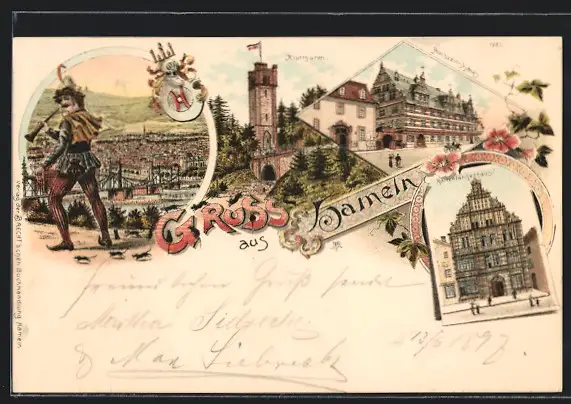 Lithographie Hameln, Blick zum Klütturm, Hochzeitshaus, Rattenfänger