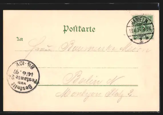 Personenbezogene Daten auf der Rückseite der Karte wurden durch blauen Textmarker unkenntlich gemacht. Die blauen Stellen sind auf die Vorderseite durchgeweicht und wirken sich negativ auf das Postkartenfoto aus