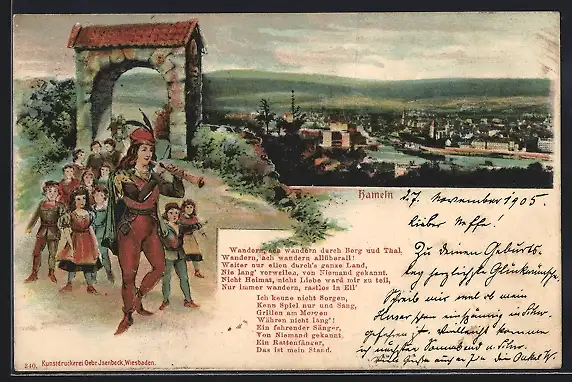 Lithographie Hameln, Der Rattenfänger führt die Kinder aus der Stadt