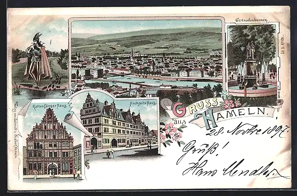 Lithographie Hameln, Hochzeits-Haus, Rattenfänger Haus, Gertrudenbrunnen