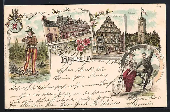 Lithographie Hameln, Hochzeitshaus, Rattenfängerhaus, Klütturm