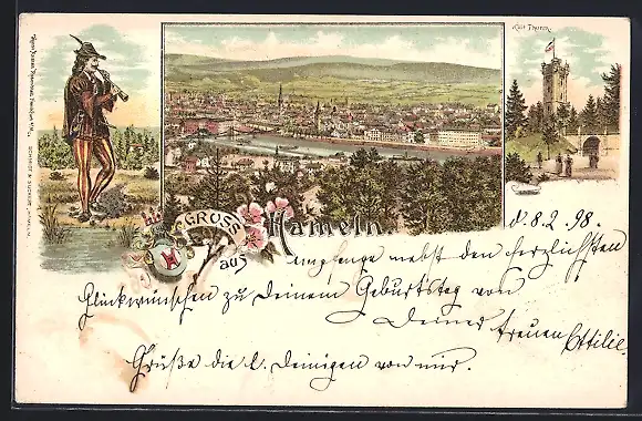 Lithographie Hameln, Klüt-Thurm, der Rattenfänger, Totalansicht