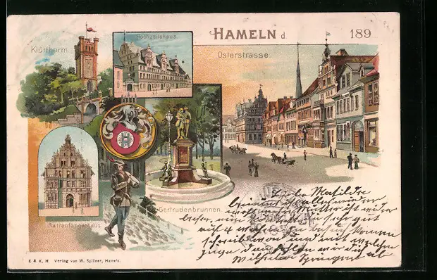 Lithographie Hameln, Klütthurm, Osterstrasse und Hochzeitshaus