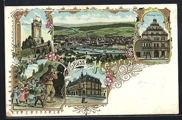 Lithographie Hameln, Klütthurm, Rattenfänger-Haus, Hotel Monopol