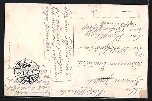 Personenbezogene Daten auf der Rückseite der Karte wurden durch blauen Textmarker unkenntlich gemacht. Die blauen Stellen sind auf die Vorderseite durchgeweicht und wirken sich negativ auf das Postkartenfoto aus