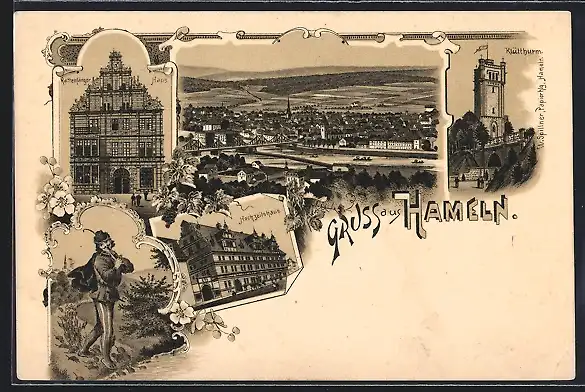 Lithographie Hameln, Rattenfänger Haus, Hochzeitshaus und Klütthurm