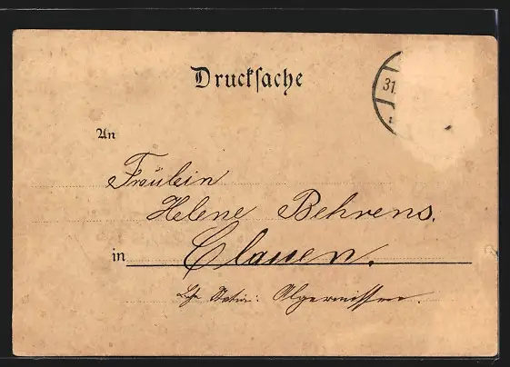 Personenbezogene Daten auf der Rückseite der Karte wurden durch blauen Textmarker unkenntlich gemacht. Die blauen Stellen sind auf die Vorderseite durchgeweicht und wirken sich negativ auf das Postkartenfoto aus