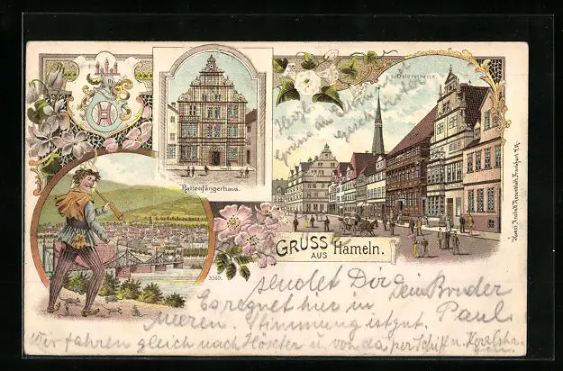 Lithographie Hameln, Rattenfängerhaus, Osterstrasse, Rattenfänger