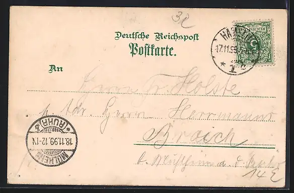 gelaufen 1899, Eckknick oben li., guter Zustand
