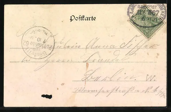 Personenbezogene Daten auf der Rückseite der Karte wurden durch blauen Textmarker unkenntlich gemacht. Die blauen Stellen sind auf die Vorderseite durchgeweicht und wirken sich negativ auf das Postkartenfoto aus
