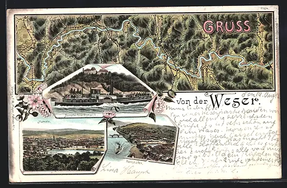 Lithographie Hameln, Totalansicht, Dampfer Fürst Bismarck, Weser Landkarte