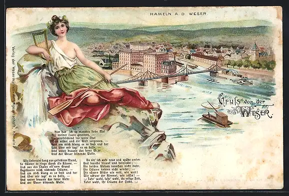 Lithographie Hameln /Weser, Totalansicht mit Brücke, Dame in Tunika