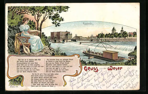 Lithographie Hameln, Weserpartie mit Ausflugsboot