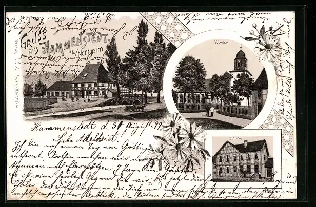 Lithographie Hammenstedt b. Northeim, Schule, Kirche, Ortspartie