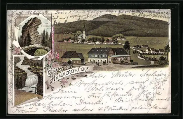 Lithographie Hammerbrücke, Riss-Wasserfall, Weidlich`s Gasthaus, Der Schnecken-Stein