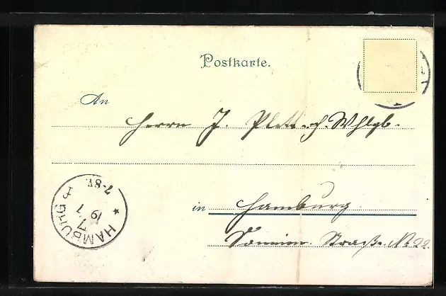 Personenbezogene Daten auf der Rückseite der Karte wurden durch blauen Textmarker unkenntlich gemacht. Die blauen Stellen sind auf die Vorderseite durchgeweicht und wirken sich negativ auf das Postkartenfoto aus