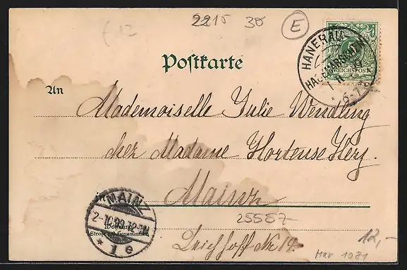 Personenbezogene Daten auf der Rückseite der Karte wurden durch blauen Textmarker unkenntlich gemacht. Die blauen Stellen sind auf die Vorderseite durchgeweicht und wirken sich negativ auf das Postkartenfoto aus