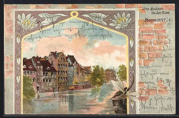 Lithographie Hannover, Alte Häuser an der Leine, Mauer-Passepartout