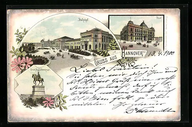 Lithographie Hannover, Bahnhof, Post, Ernst-August-Denkmal