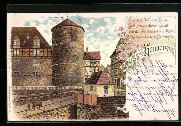 Lithographie Hannover, Beguinenturm, Strassenpartie