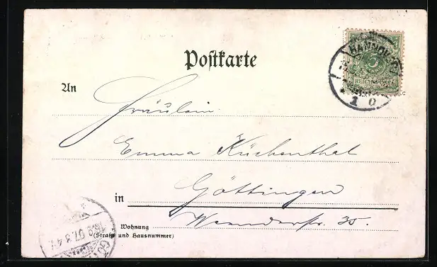Personenbezogene Daten auf der Rückseite der Karte wurden durch blauen Textmarker unkenntlich gemacht. Die blauen Stellen sind auf die Vorderseite durchgeweicht und wirken sich negativ auf das Postkartenfoto aus
