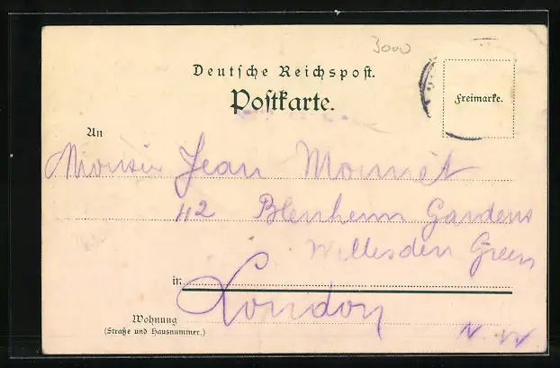 Personenbezogene Daten auf der Rückseite der Karte wurden durch blauen Textmarker unkenntlich gemacht. Die blauen Stellen sind auf die Vorderseite durchgeweicht und wirken sich negativ auf das Postkartenfoto aus