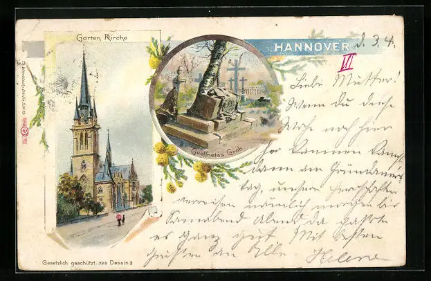 Lithographie Hannover, Garten-Kirche, Geöffnetes Grab