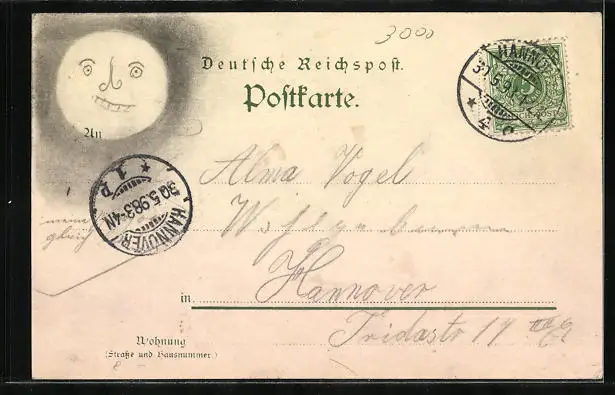 Personenbezogene Daten auf der Rückseite der Karte wurden durch blauen Textmarker unkenntlich gemacht. Die blauen Stellen sind auf die Vorderseite durchgeweicht und wirken sich negativ auf das Postkartenfoto aus