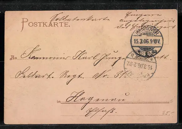 Personenbezogene Daten auf der Rückseite der Karte wurden durch blauen Textmarker unkenntlich gemacht. Die blauen Stellen sind auf die Vorderseite durchgeweicht und wirken sich negativ auf das Postkartenfoto aus
