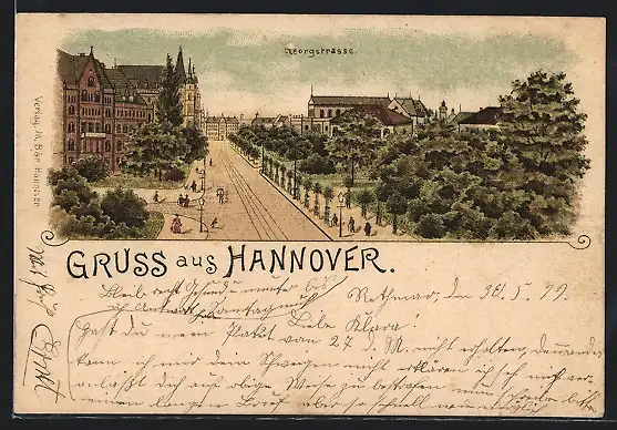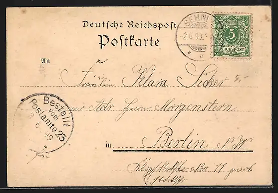Personenbezogene Daten auf der Rückseite der Karte wurden durch blauen Textmarker unkenntlich gemacht. Die blauen Stellen sind auf die Vorderseite durchgeweicht und wirken sich negativ auf das Postkartenfoto aus