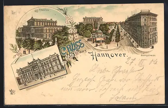 Lithographie Hannover, Georgstrasse, Kgl. Theater und Ständehaus