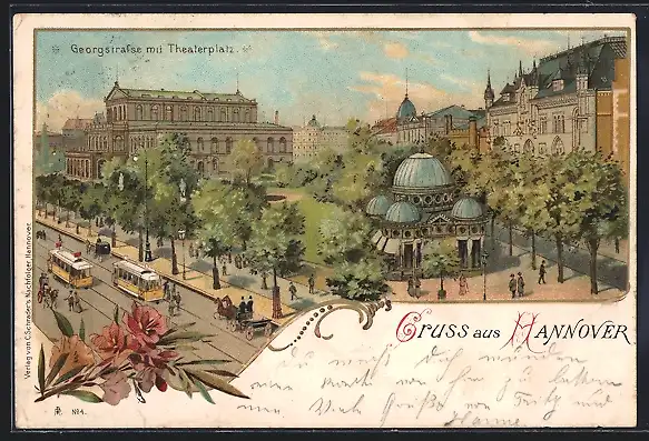 Lithographie Hannover, Georgstrasse mit Strassenbahn und Theaterplatz